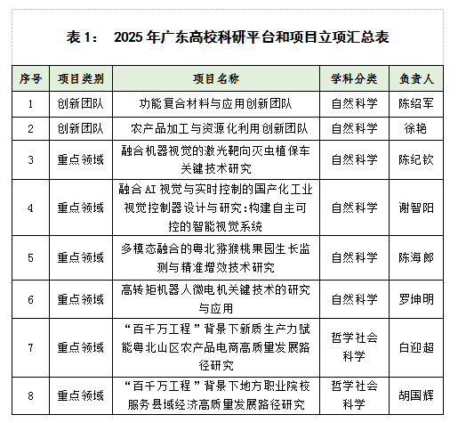 近日,广东省教育厅公布了重点科研平台及项目以及教育科学规划课题(高等教育专项)的立项公示名单,我校总立项数达15项,立项总数在粤东西北地区高职院校排名第二,连续多年处于粤东西北高职院校前列,充分彰显了学校较强的科研实力与蓬勃的创新活力。其中科研平台和项目8项(详见表1),立项数量在粤东西北地区高职院校排名第一;教育科学规划课题(高等教育专项)7项(详见表2),立项数目在粤东西北地区高职院校排名第二。