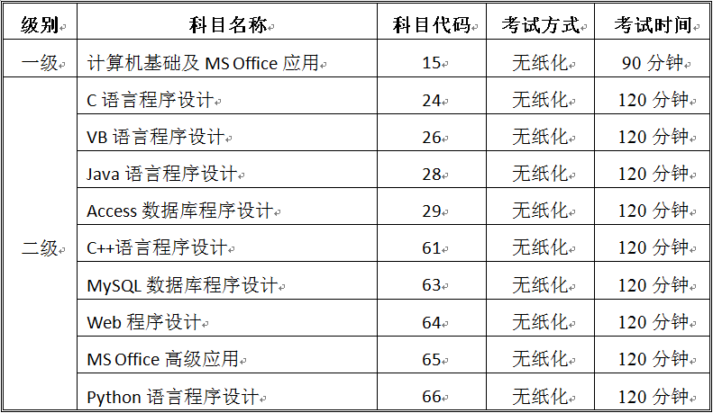 2019年上半年全国计算机等级考试开考科目(时搏官方网站考点)