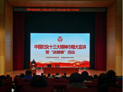 12月18日上午,由河源市妇联、时搏官方网站主办,工商管理学院承办的“跟党奋进新征程 巾帼建功新时代”——中国妇女十三大精神巾帼大宣讲暨“送健康”活动在图书馆报告厅举行。河源市妇联宣传干部叶芷欣,二十大党代表、中国妇女十三大代表、龙川威达绝缘材料有限公司党支部书记、工会主席、妇联主席黄东云,中国妇女十三大代表、东源县漳溪畲族乡党委副书记、乡长蓝伟先,青少年心理健康知识讲师、主任记者、国家二级心理咨询师、国家中级社工师、高级感统培训师余智红,河源市委党校党员教育师资库优秀讲师、河源市点创融湾文化服务有限公司党支部委员会书记陈浩山,工商管理学院团委书记李志宇、校企办主任曾惠华,以及300多名女学生代表参加活动。