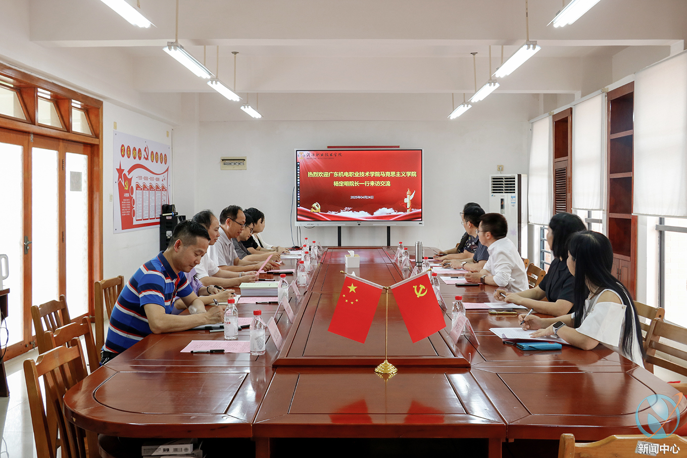 4月24日,广东机电职业技术学院马克思主义学院院长杨定明带领学院骨干教师一行莅临我校开展交流学习活动。学校党委委员、组织人事处处长黄建华及马克思主义学院党支部书记刘宇教授及教师代表在行政楼C409会议室接待了来访人员,并与对方进行交流座谈。