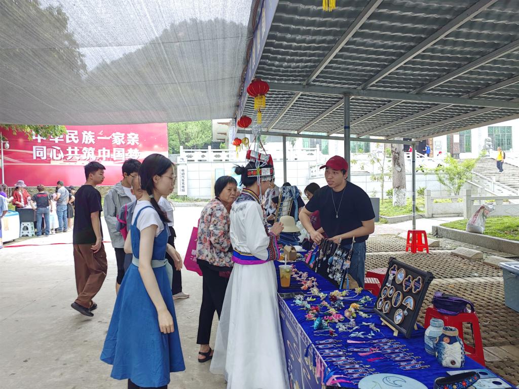 活动现场,学院师生以“科技特派员+非遗创新创业团队”模式,向民众展示了包括蓝染布艺、畲族图腾饰品及“客畲蓝梦”主题服饰等系列文创作品。这些作品结合传统工艺与现代设计,吸引了大量游客驻足体验。师生团队还通过现场教学,向游客演示蓝染技艺、畲绣针法、非遗压花等非遗工艺,让传统技艺“可触可感”,进一步推动了畲族文化从静态保护向活态传承的转变。
