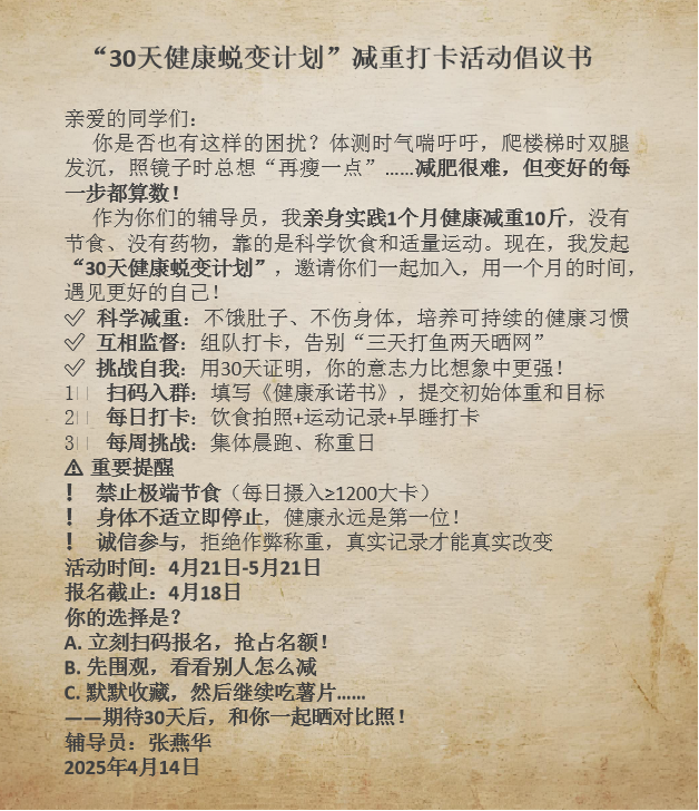 张燕华副教授利用工作之余,指导学生靠科学饮食和适量疼,科学减重,用30天证明你的意志力比想象中的更强,引导广大学生将身体健康永远摆在第一位。