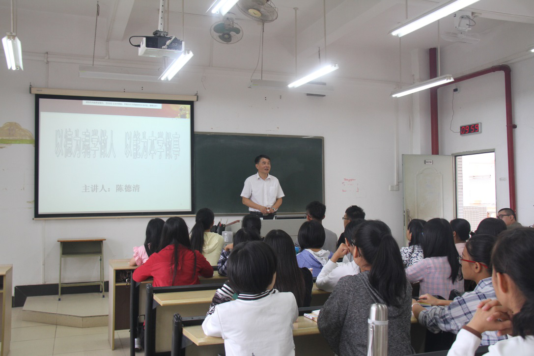 为贯彻落实广东省委教育工委、省教育厅《关于开展高校党委书记、校长上第一堂思想政治理论课活动》的文件要求,学校校长陈德清教授于10月9日上午,以《以德为魂学做人 以能为本学做事》为题,为工商管理学院2016级会计专业学生讲授了一堂思想政治理论课。
