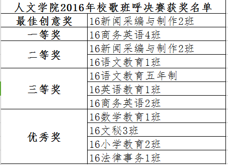 10月25日晚,我院于学术报告厅举行2016年校歌班呼决赛暨人文十星颁奖晚会。学院负责人罗春娜、副院长谢战锋、办公室主任刘少燕、全体辅导员、参赛班级及人文十星参加了此次活动。
