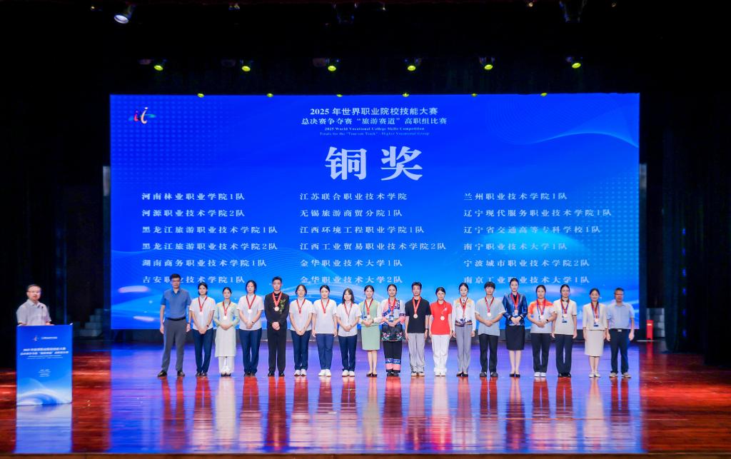2025年8月23日至27日,2025年世界职业院校技能大赛总决赛争夺赛“旅游赛道”高职组比赛在浙江旅游职业学院举行。本次比赛由教育部、文化和旅游部等单位主办,浙江省人民政府、浙江省文化广电和旅游厅承办,浙江旅游职业学院协办,吸引了全国32个赛区,共174支队伍,共1300余名选手参赛。我校工商管理学院负责人张颖带领杨红霞、冯四朵两位指导及叶丽荣、李舒仪、朱倩倩、关开偲共四位同学组成的参赛团队赴浙江旅院参赛,并在总决赛旅游赛道中获得铜奖。