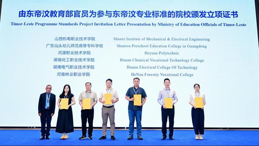 (东帝汶教育部官员为我校颁发“国家专业标准”立项证书)