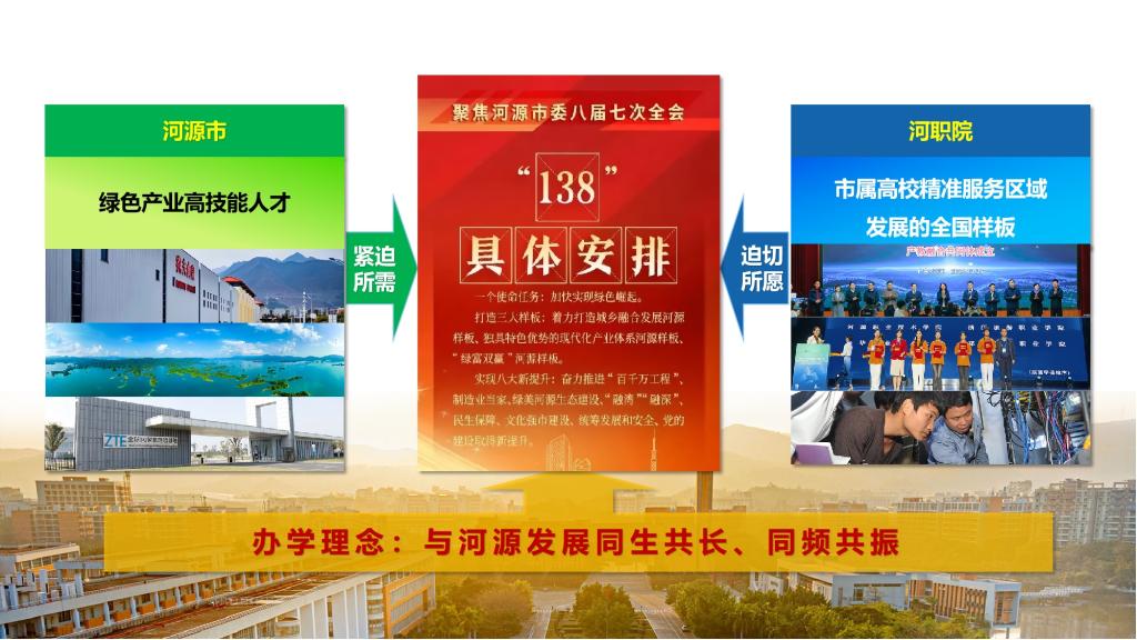 当前,学校正锚定“市属高校精准服务区域发展的全国样板”与“绿色产业高技能人才培养摇篮”的发展目标,紧紧围绕省委1310部署和河源市委138安排,主动对接服务河源“1+3”产业集群和现代农业“1+3”产业体系发展需要,更加明确提出了“河职院发展要坚持与河源市发展同生共长、同频共振”的办学思路,围绕现代农业与水经济产业、现代服务业、新一代电子信息产业进行全面深化改革和布局谋划,全力“助绿美河源崛起、立地方高职标杆”。